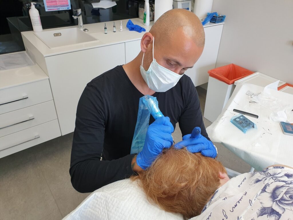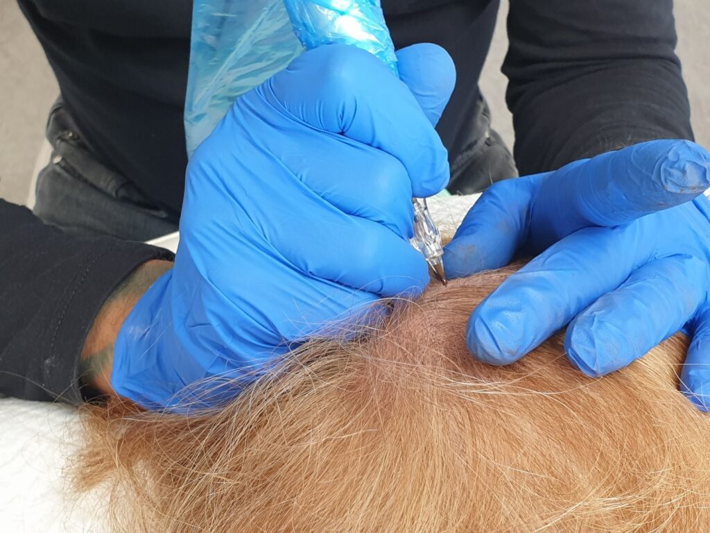 Jest to szczególnie dogodne rozwiązanie w dwóch sytuacjach. Gdy pacjent goli głowę i chcemy za pomocą mikropigmentacji optycznie zmienić położenie linii włosów (najczęściej – zlikwidować widoczne zakola). Znakomity efekt estetyczny! Gdy mamy do czynienia z łysieniem androgenowym rozlanym na znacznym obszarze głowy (włosy są rzadkie i cienkie) – znajdujący się w skórze, dobrze dobrany kolorystycznie pigment, będzie skutecznie maskować ubytki gęstości włosów.